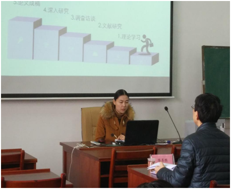 张佳谱、何曾艳、白珊、李凤、唐维等5位同学以PPT的方式,陈述了各自论文的选题背景、选题意义、国内外研究现状、研究思路、研究方法、研究内容、研究展望、研究创新等要点,并回答专家组成员提出的专业知识点,以及论文的论点、论据、论证等方面的问题。专家组成员对研究内容的可行性、文字表达的规范性等适时进行了点评,并提出进一步完善的具体建议。