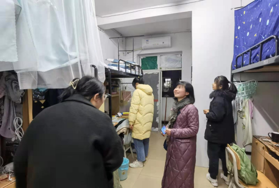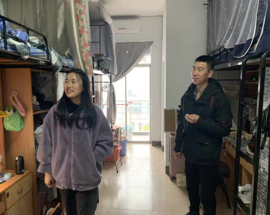 在员工寝室的走访中,班主任老师、辅导员老师逐间对员工进行看望,了解员工们的宿舍生活状况,与员工交流新学期的规划,并叮咛员工们要搞好寝室的文明卫生,要注意用电用水安全,要努力营造寝室和睦团结的良好氛围。(撰稿人:曹炜悦;初审:石蕙;终审:陈建军)