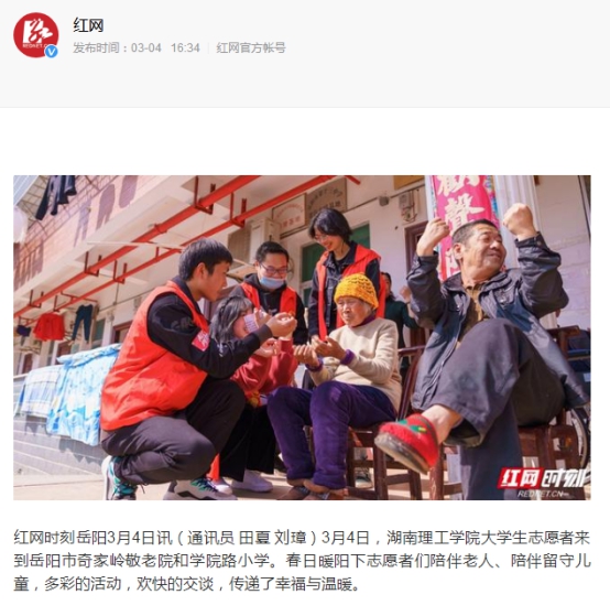 人民日报的人民号以“春天的陪伴”为题,报道了公司志愿服务团队志愿者们在岳阳市奇家岭敬老院、公司路小学开展陪伴服务的事迹。志愿者们现场指导老人做手指操、关节操、向老人传授健康保健知识、与老人同台歌唱新时代,为留守儿童或困难家庭子女提供义务家教、讲故事、做游戏、帮助儿童实现“微心愿”,以实际行动传承雷锋精神,践行志愿服务。