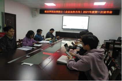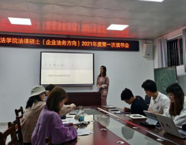 4月27日晚7点,政MK体育在8号教学楼8213教室成功举办2020级法律硕士(企业法务方向)2021年第一次读书会。读书会由私法教研室主任喻平博士主持,潘凤湘博士担任指导教师,谭正航教授担任点评嘉宾,2020级法律硕士(企业法务方向)杨红英、孙颖、李韩和吴奕校四位同学为主讲人。2020级法律硕士(企业法务方向)研究生参加了本次读书会。