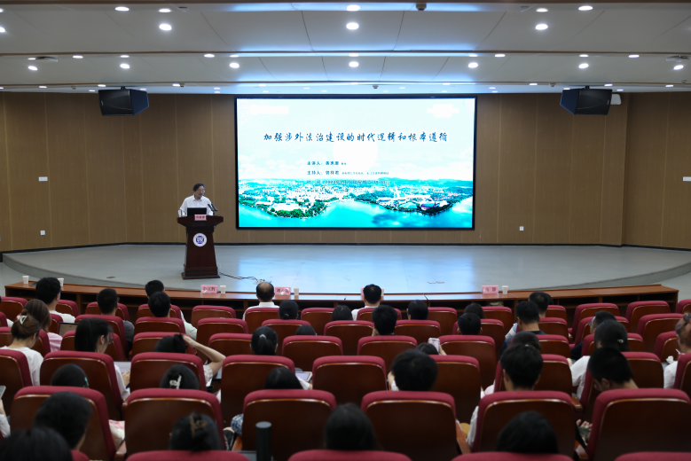 聚焦新时代加强涉外法治建设的根本遵循和时代逻辑,黄教授深入解剖和分析国内外法治发展现状强调继1979年“第一个春天”后“涉外法治人才的第二个春天已经到来”,鼓励法学专业员工抓住机遇,积极投身涉外法治事业。围绕“加强涉外法治建设的根本遵循、涉外法治建设的时代逻辑”,引用习总书记“要从更好统筹国内国际两个大局、更好统筹发展和安全的高度,深刻认识做好涉外法治工作的重要性和紧迫性,建设同高质量发展、高水平开放要求相适应的涉外法治体系和能力,为中国式现代化行稳致远营造有利法治条件和外部环境”,对其进行多方面解析,让现场师生对新时代加强涉外法治建设有更深认识。