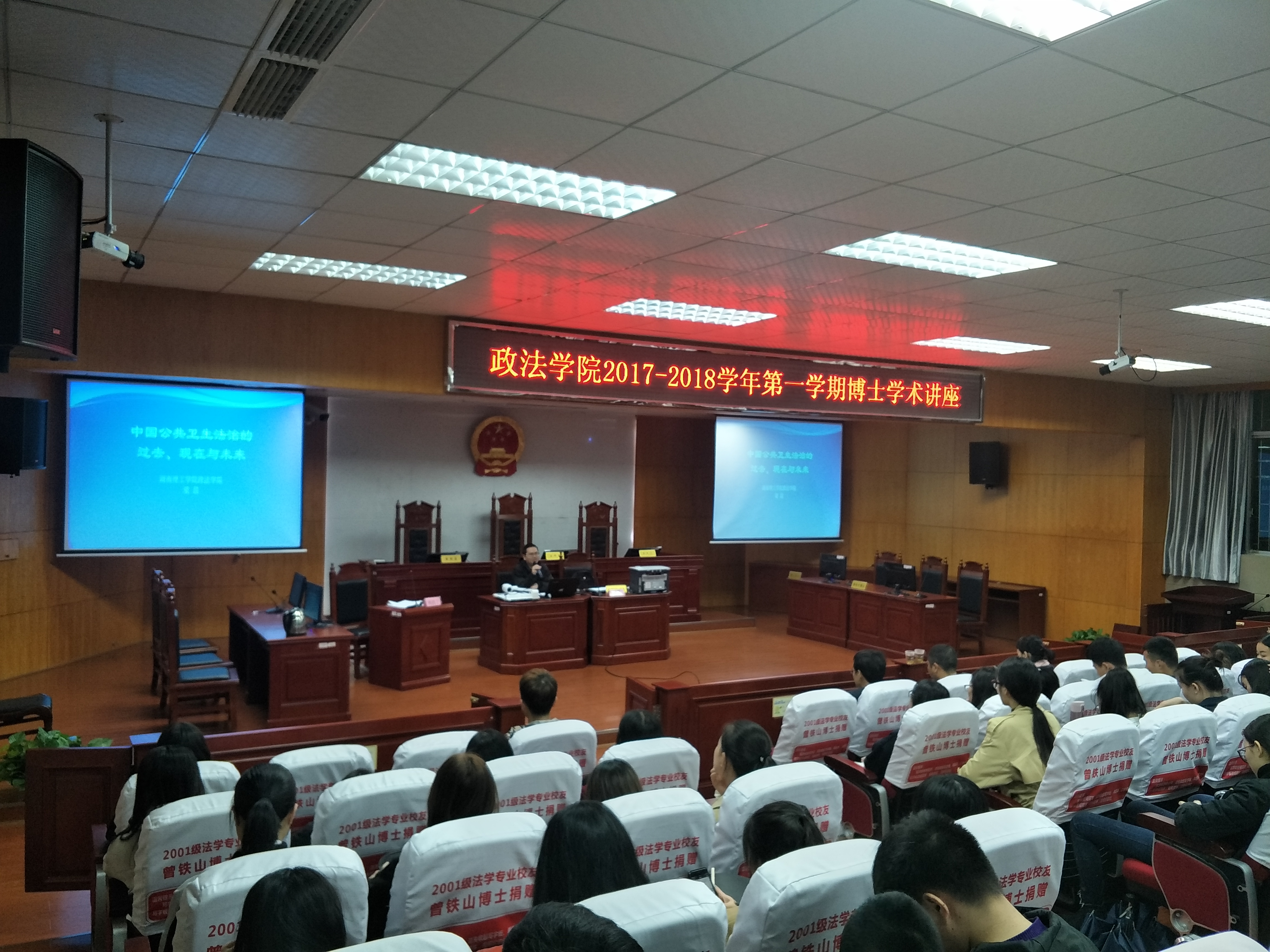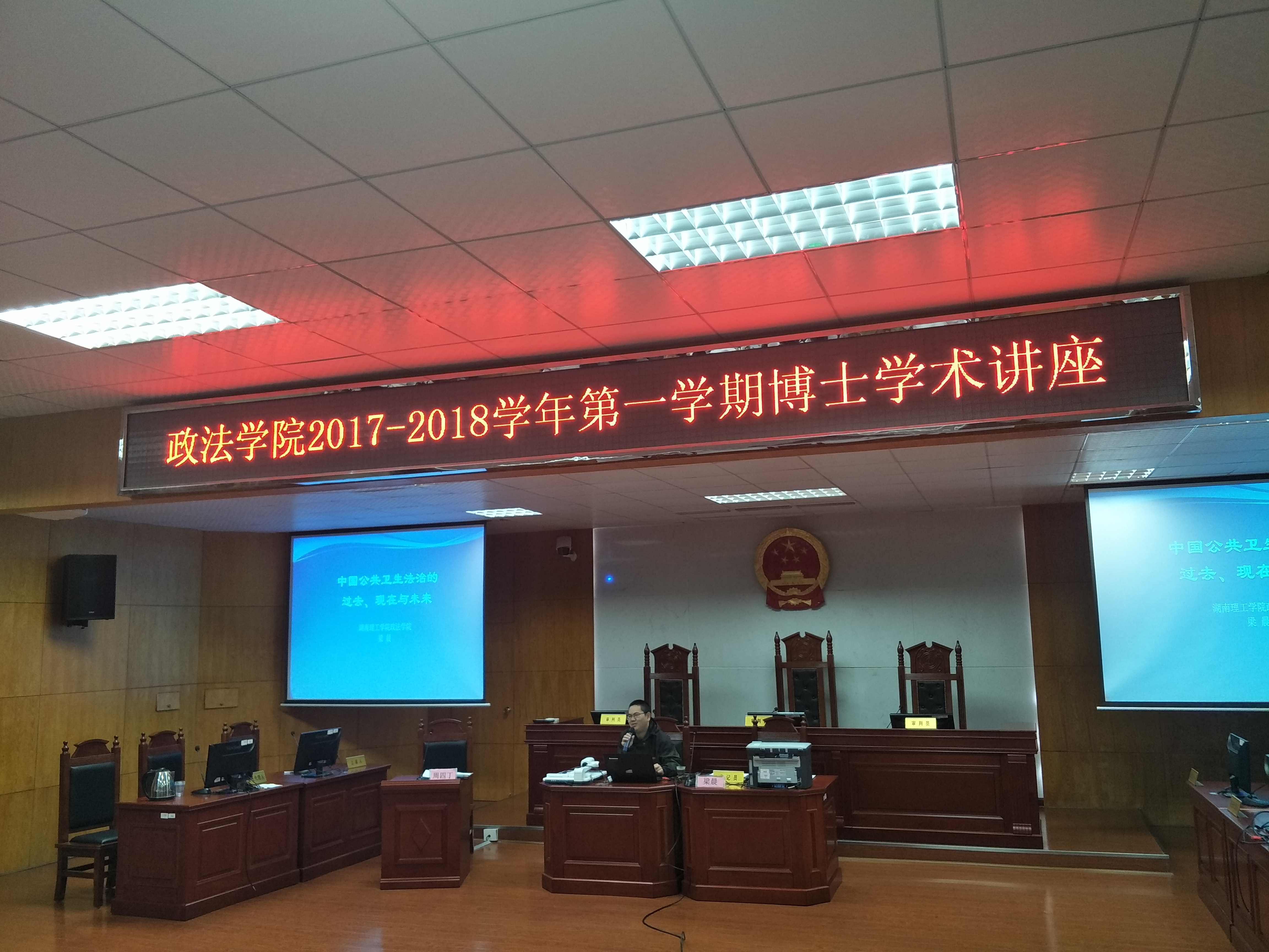 11月13日晚,政MK体育博士学术讲座月活动第三场讲座于八栋模拟法庭举行。政MK体育公法教研室主任梁晨博士就“中国公共卫生法治的过去、现在与未来”这一主题展开一场精彩的演讲。政MK体育副经理周四丁副教授、法学教师夏尊文副教授、经理助理尹晓闻博士、出席了此次讲座,政2015级全体法学专业员工聆听了此次讲座。