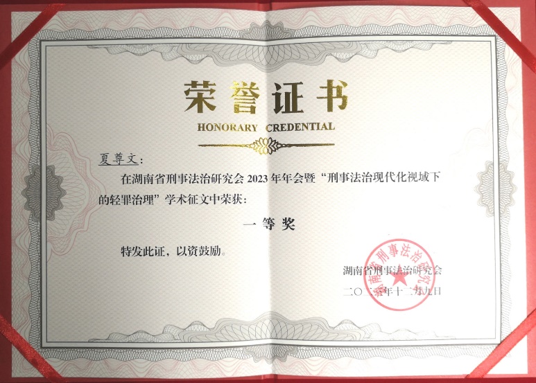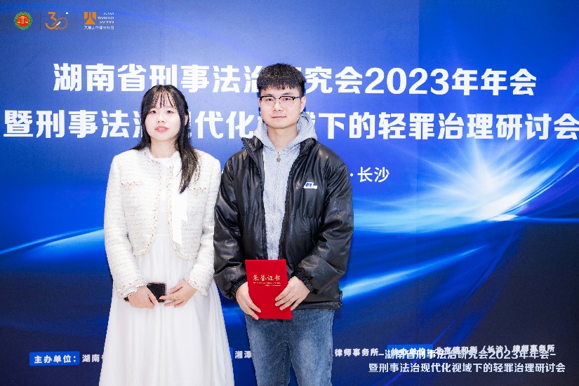 据湖南省刑事法治研究会监事长孙珺涛介绍,本次研讨会共收录来自全国260余篇高质量主题论文,是实务界与理论界构建治罪与治理并重的轻罪治理体系建设的阶段性研究成果,经评审委员会针对选题质量、研究水平、撰写规范性和创新与成果等方面进行打分,择最优成绩设奖。共评选出一等奖5名、二等奖10名、三等奖35名。夏尊文老师提交的论文——《针锋相对反驳我国轻罪扩张的支持者》荣获年会征文一等奖,由马梓豪同学代为领奖。