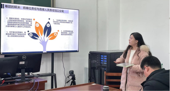 第三位主讲人柳若宣同学就“浅谈刑事合规视域下单位归责理论的优化”这一主题进行分享,柳若宣同学指出在刑事合规视域下,单位归责理论面临优化需求。传统理论虽承认单位犯罪与自然人行为的紧密联系,但未充分考虑单位自身的独立性。为解决这一问题,应提倡组织体刑事责任论。在具体案件中,应充分评估单位的合规整改情况,允许合规企业在满足一定条件下获得刑罚减免。这样既体现单位犯罪理论的现代性,又能实现实质公平。但如何具体实施这一理论,仍需进一步探讨和明确。