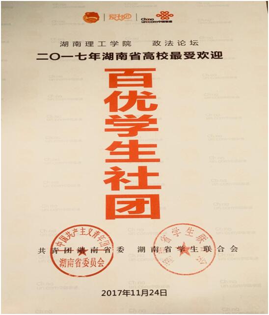由共青团湖南省委、湖南省学联共同主办,中国联通湖南省分公司协办的“WO爱社团”2017年度湖南省高校“百优十佳”员工社团网络推选活动颁奖典礼于11月24日在中南林科大举行。政MK体育的“政法论坛”喜获全省高校最受欢迎“百优十佳”员工社团评选的“百优”社团称号。“政法论坛”负责人、2016法学专业员工辛佩齐代表政MK体育登台受奖。