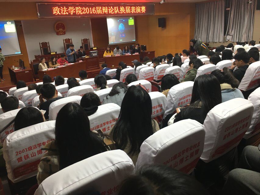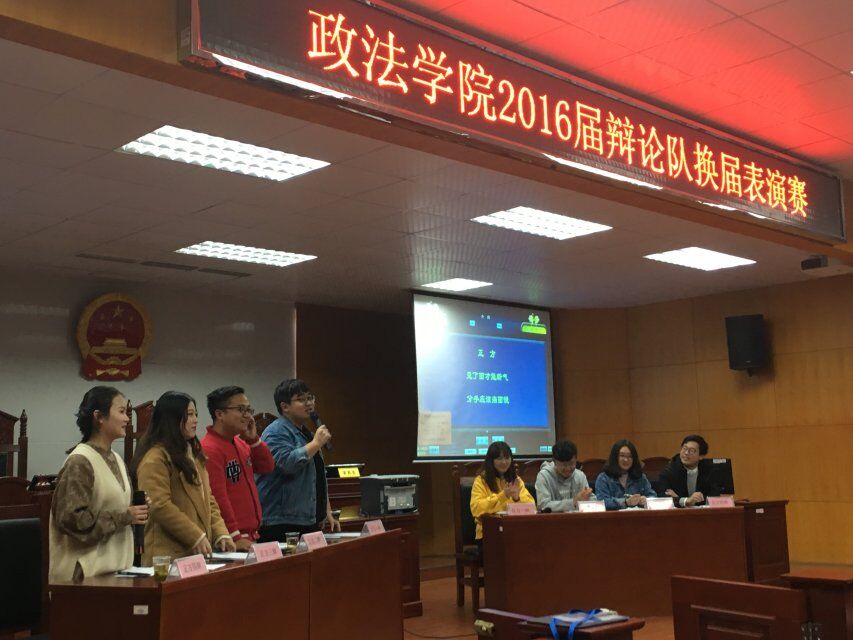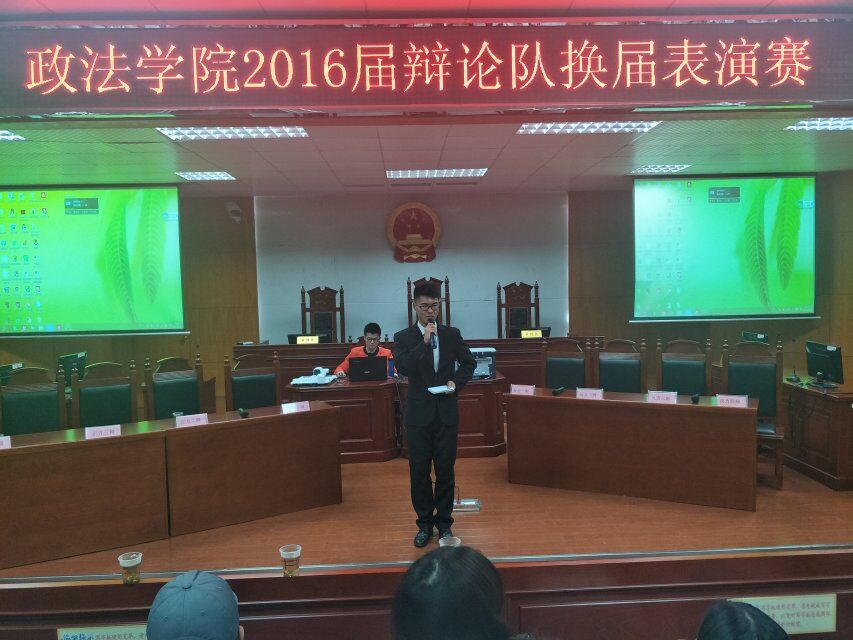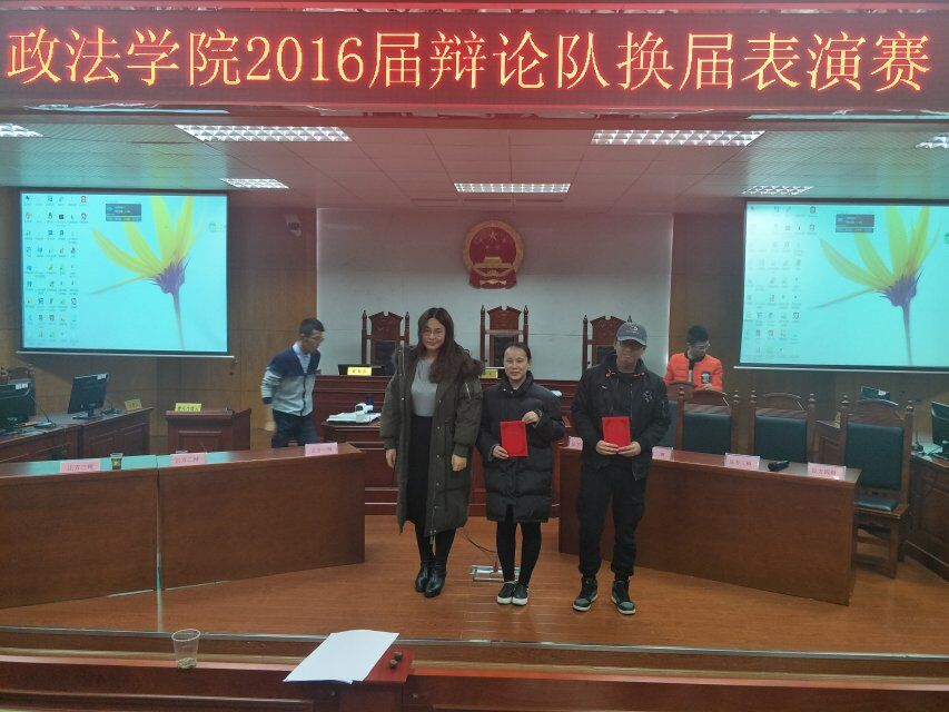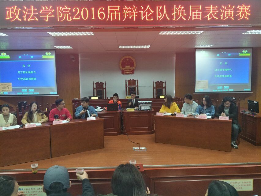 为营造格调高雅的校园文化氛围、宣传辩论明道正言的精神,政MK体育团总支、员工分会学习部于12月10日晚7时在8号教学楼模拟法庭举行2016届辩论队换届表演赛。团学分会主席团部分员工干部及2015、2016级辩论队成员参加此次表演赛。2017级部分员工观看此次表演赛。孙湘棋担任比赛主持人。