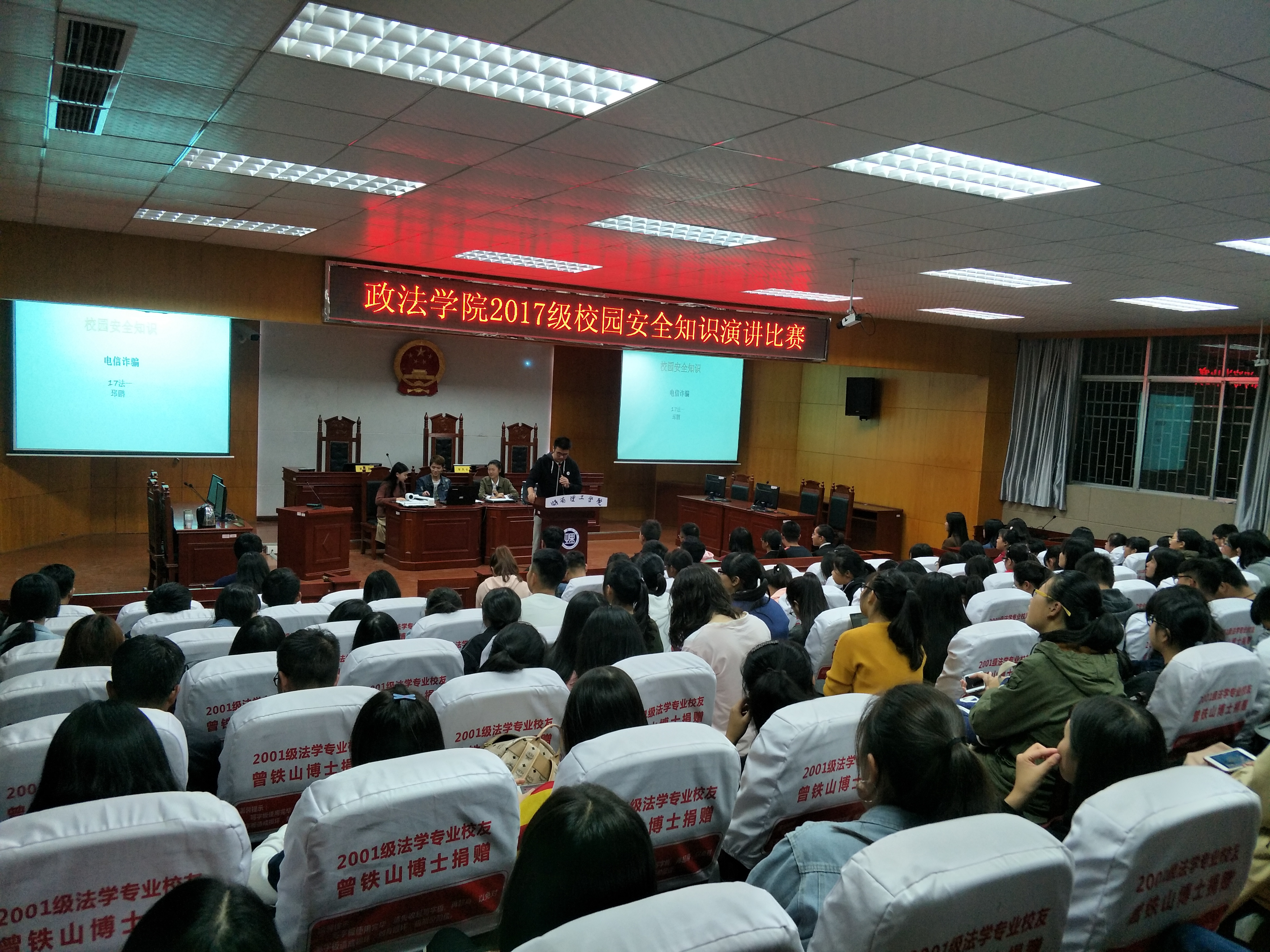 为提高员工的安全防范意识,营造平安和谐的校园环境,10月31日晚7时,政MK体育在8号教学楼模拟法庭开展校园安全知识演讲比赛,公司团学分会员工干部、2017级员工参加了此次演讲比赛。