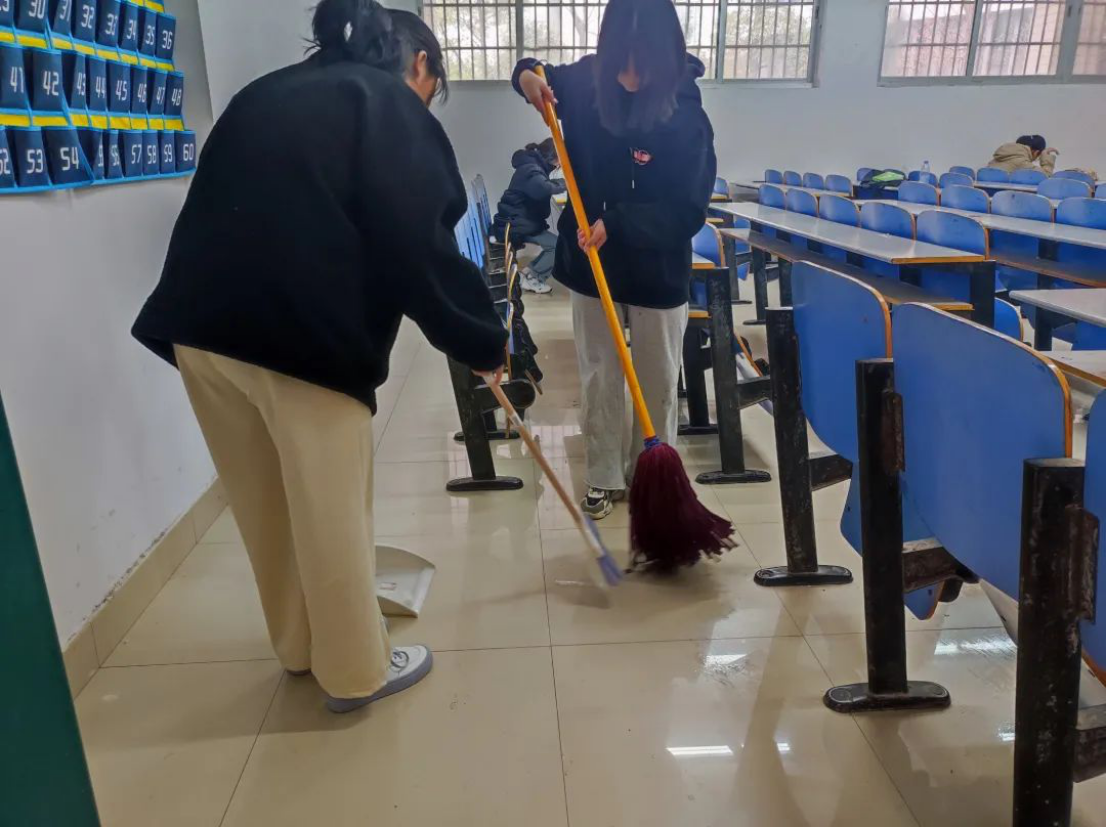 到了教学楼,同学们自带劳动工具,自主进行劳动,各司其职,扫地、拖地、负责、擦拭,整理……经过几个小时的劳动,教学楼从地面、桌面、墙面到门都干净明亮,焕然一新,环境卫生状况得到了明显的改善。