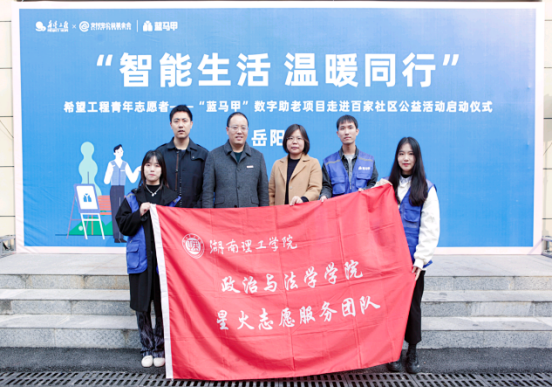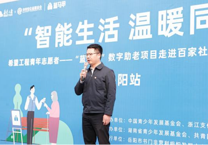为帮助老年人融入数字生活,发扬青年志愿者精神,12月9日由中国青少年发展基金会与支付宝(杭州)信息技术有限公司共同主办的“蓝马甲”关爱老人公益项目(以下简称“蓝马甲”)---岳阳站启动仪式在岳阳楼区运通街91号运通社区举行。湖南省青少年发展基金会资助事业部部长喻慕鸿、团市委书记綦小广、mksport体育团委书记司念伟及校团委办公室主任郭云峰共同出席参与启动仪式。政MK体育“星火”志愿服务团队指导老师钟艳、团队负责人段天梅等志愿者参加启动仪式。