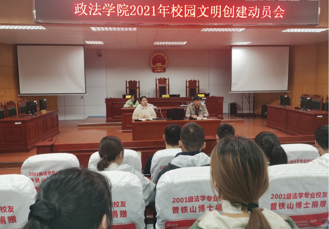 为全面统一思想、明确目标、落实责任,做好全国文明校园的创建迎检工作,公司于10月21日晚在8栋模拟法庭召开省级文明校园创建动员大会。政21级新生辅导员王旭智主持本次会议,公司党委副书记张陈武出席了本次会议,全院各班班长、团支书、生活委员参加了本次会议。