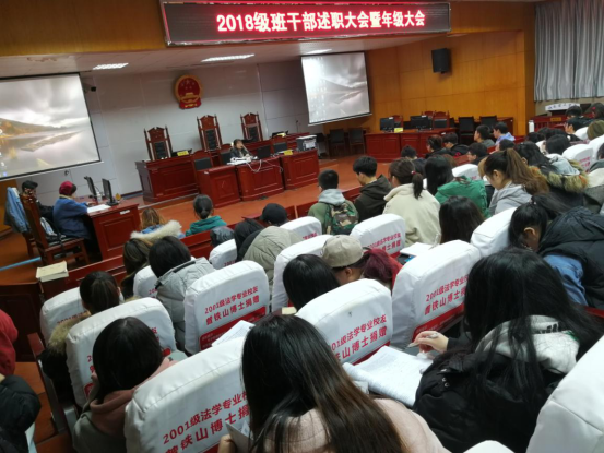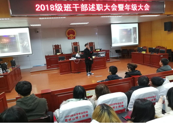 为总结班级工作成效,提升班级管理的争先创优意识,并安排好学期末相关工作,12月24日晚,政MK体育在八栋教学楼模拟法庭举行了2018级班干部述职暨期末年级大会。会议由2018级辅导员魏嘉琦主持,2018级全体员工参加会议。