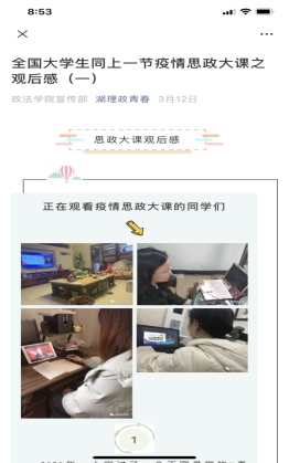 此外,学工线还组织开展形式多样、内容丰富、贴合实际的网络主题班会、学习活动等。公司全体辅导员或以文字形式,或以视频形式,在公司微信公众号上对员工开展疫情防控教育和爱国主义教育。例如,2018级辅导员魏嘉琦录制的“共抗疫情、爱国力行”网络文化作品微视频,以生动的语言、活泼的形式,吸引了众多员工的关注和模仿,点击率达300多人次,达到了较好的宣传教育效果。同时,公司微信公众平台上还通过疫情防控期间志愿者故事分享、全国老员工思政大课堂员工感受分享、全国哀悼活动感悟分享等内容,让思政教育达到线上线下“同频共振”。