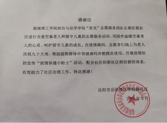 “星火”志愿服务团队在指导老师钟艳的带领下,在今年上半年全国疫情防控的关键时期,积极参与到社区的疫情防控工作中,通过线上连线等方式为社区老人送温暖、送关爱、送服务,化解老人的紧张情绪,指导社区老人进行健康码申领和使用,为社区做好疫情防疫出谋划策,贡献力量。在全省2020年疫情防控应急志愿服务专项赛评比中,“星火”志愿服务团队在特殊时期贡献出的青春力量也得到了评审们的肯定和认可,获得了较好的成绩。