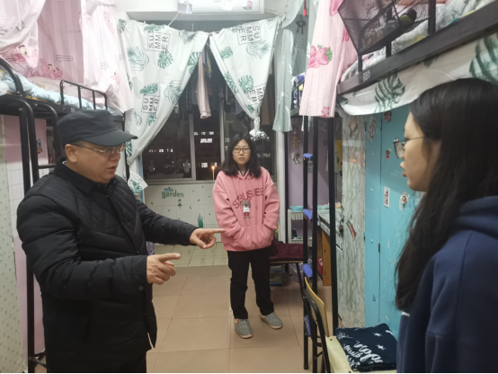 检查组老师们进入寝室后,仔细查看寝室生活设施、卫生状况、用电安全等情况,与员工交流了寝室管理的问题和意见,反复叮嘱同学们要注意寝室防火安全,切记不可使用大功率违禁电器,以免发生火灾等突发情况。陈建军书记在检查中,对寝室内每间床铺是否铺有电热毯、插线板是否安装在安全位置、是否存在违章电器等都逐一进行了仔细检查,对存在安全隐患的寝室督促其立即整改,对锁门的寝室安排人员留守直至来人后当即开门检查。同时,老师们还亲切地询问了同学们在校的学习和生活情况,勉励同学们要继续保持积极向上的精神面貌,遵守寝室文明条例,注意离开寝室时一定要断电关灯。老师们指出各寝室长应当负起责任,充分调动每一位寝室成员的责任心,做到“寝室安全,人人有责”。
