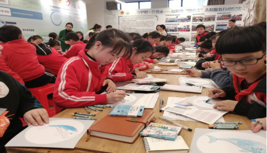 政2018级员工、志愿者吴昊楠向小员工们主讲了“候鸟的欢歌”、“江豚的微笑”、“麋鹿的倩影”三个板块,员工们认真聆听讲解。随后,志愿者引导小员工们一起收看了长江渔民的访谈、江豚的生活习性视频以及长江保护普法视频,借此强化员工们保护珍稀动物以及母亲河的决心。志愿者还带领员工们进行了丰富有趣的游戏环节——“我来说,你来找”的竞猜游戏、“彩绘江豚”的绘画游戏以及“我手写我心”,员工们积极参与,现场气氛热烈,在欢快的游戏氛围中本次主题活动课圆满落幕。
