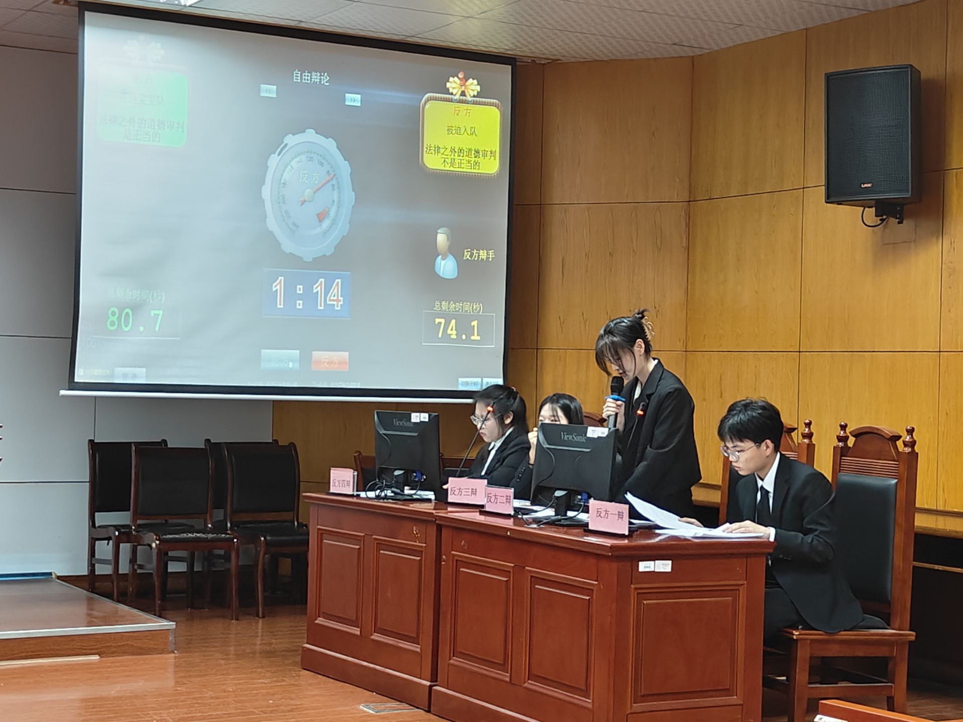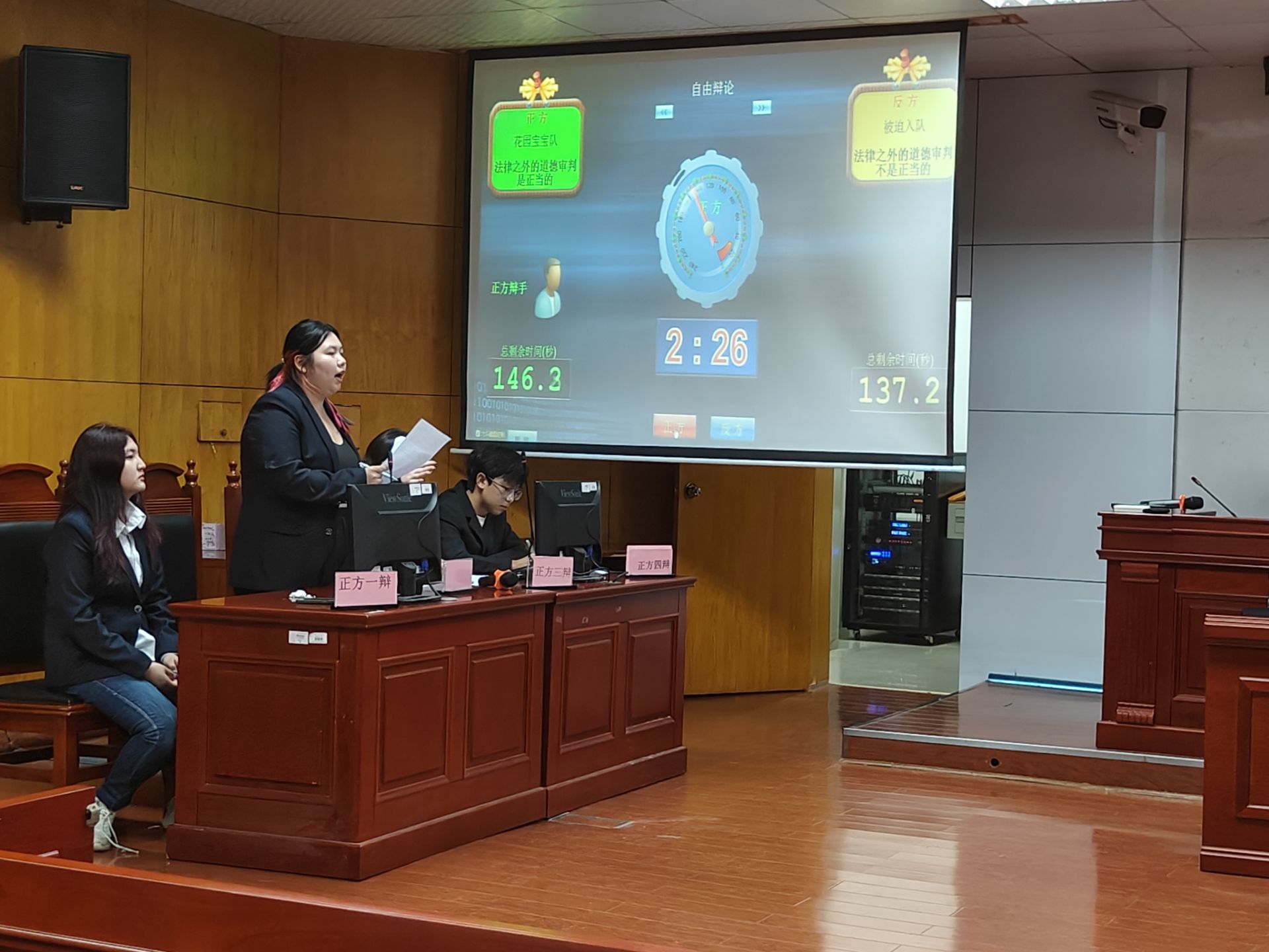 比赛于模拟法庭进行,辩题为:“法律之外的道德审判是/不是正当的”,“花园宝宝队”持正方,“被迫入队”持反方,MK体育辩论队队长何璇担任主席。与以往不同的是,本次比赛未启用专业评委,而是邀请55位大众评审,决定冠军的归属。