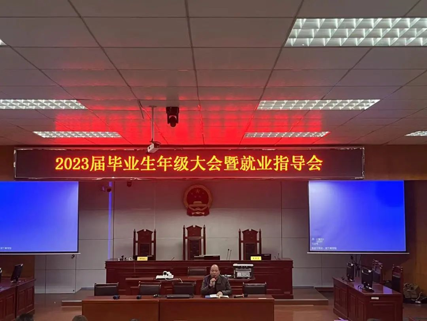 为帮助毕业生明确未来就业方向,顺利完成毕业,公司于3月30日在模拟法庭召开2023届毕业生年级大会暨就业指导会。党委书记喻义东、党委副书记张陈武、就业专干王旭智、教学秘书任蓉以及全体毕业生参加此次会议。