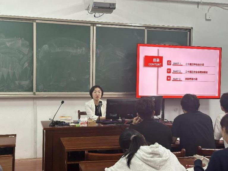 薛静以“党的二十届三中全会精神解读”为题,从“二十届三中全会基本情况介绍”“二十届三中全会精神解读”“贡献精神力量”三个方面出发,结合青年个人发展作了全面系统解读。薛静指出,实现中国式现代化,重点是全面深化改革,扎实推进经济发展领域改革,深化教育科技人才体制机制改革,着力解决发展不平衡不充分问题。