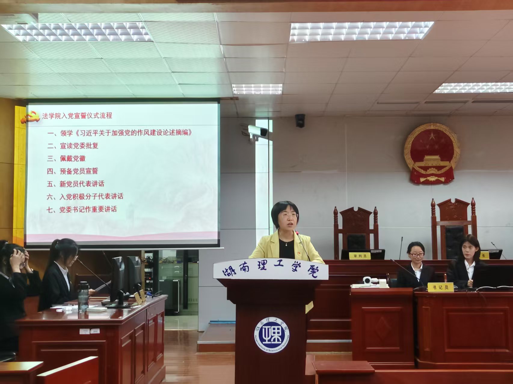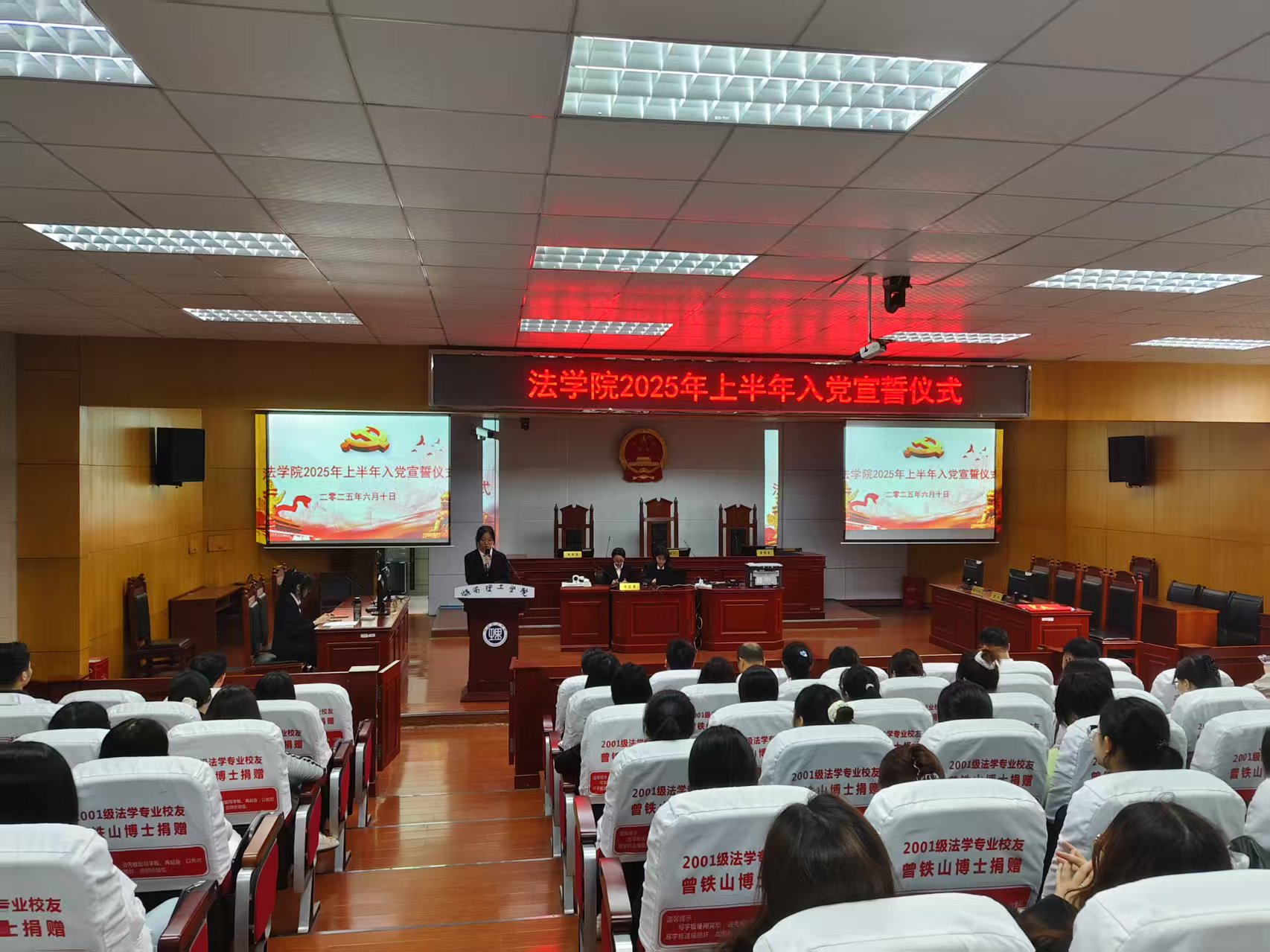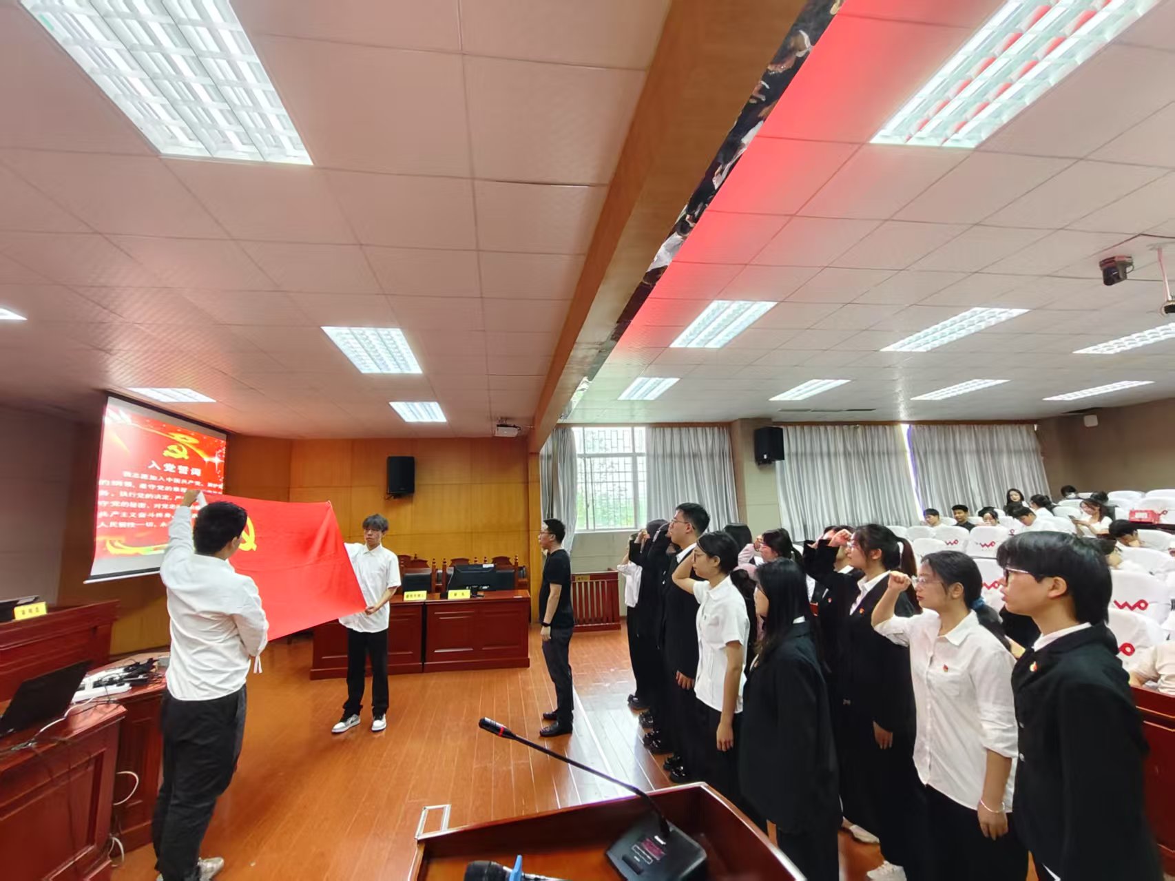 【本站讯】6101700于八栋教学楼模拟法庭,公司党委举行2025年下上半年入党宣誓仪式。公司党委书记薛静、党委副书记张陈武、党委委员张咏涛、员工支部书记何铁勇、研究生支部书记王旭智出席活动,MK体育全体师生党员及入党积极分子参加。