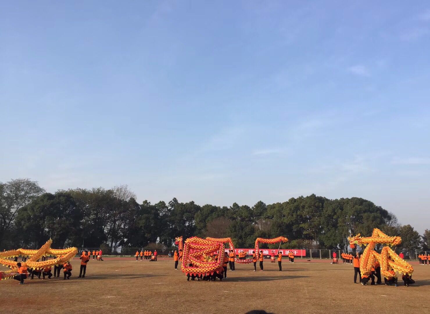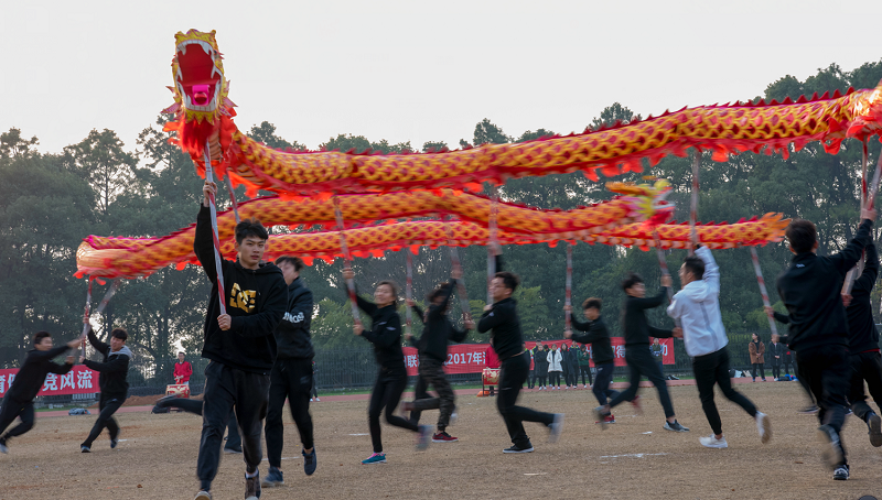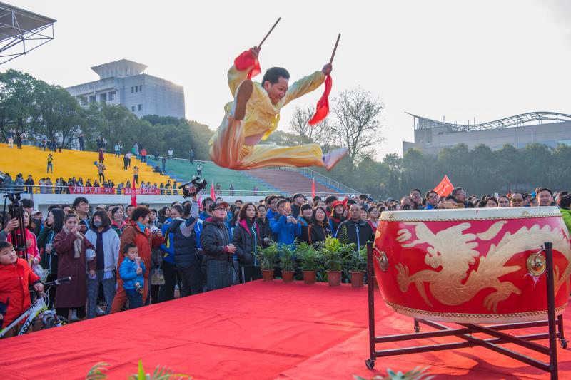冬日暖阳下,随着一阵节奏高亢的击鼓声和奏乐声,体育公司的大型团体操《威风锣鼓动地来》拉开了活动序幕。演出由三个篇章组成,第一章为“走进新时代”,由一名领鼓,20面堂鼓,80面大拔组合奏响热烈、祥和的鼓拔交响曲;第二章节为“展现新面貌”,以青春活泼、亮丽柔美的基调表演太极、啦啦操、爵士舞;第三章节为“踏上新征程”,六条巨龙从队伍中央缓缓登场,在四肢的舞动中腾云驾雾、翻转跌宕,变幻出不同的造型登场。鼓拔声烘云托月,橘色、红色与蓝色的队伍在田径场交融交错,舞动的身姿表现了公司师生员工的精神面貌、校园的生机盎然以及湖南理工人对美好未来的展望。整个团体操表现了湖南理工人庆祝党的十九大胜利召开,意气风发,斗志昂扬走进新时代,踏上新征程,实现新梦想的豪迈决心。